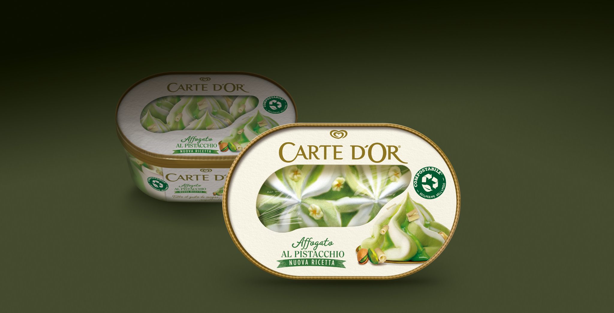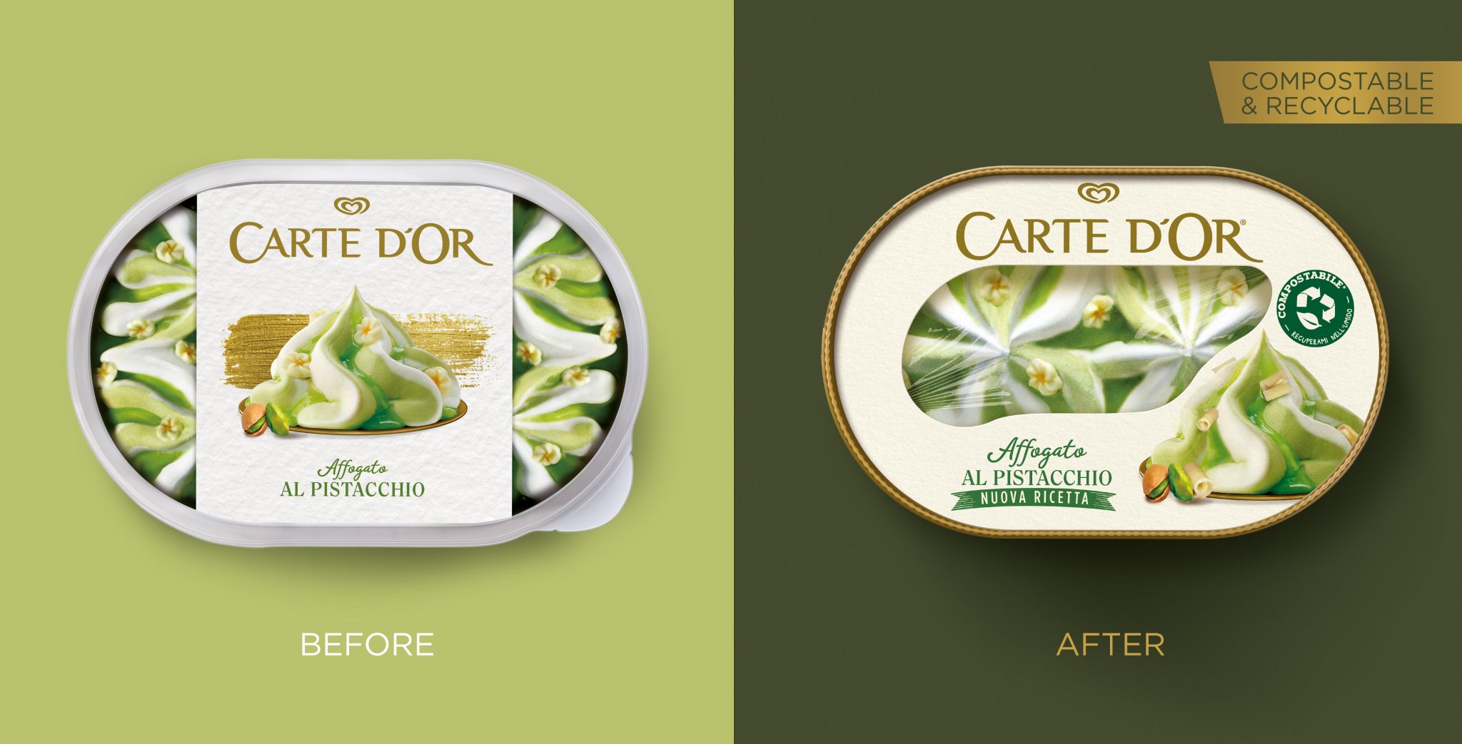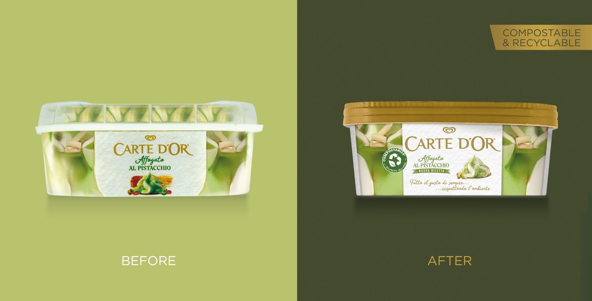 Carte D‘Or Affotion系列的新包装是可堆肥和可回收的,因为它由PEFC认证的纸张(使用可持续管理的森林和受控来源的原材料生产)制成,再加上一层PLA(聚乳酸,即从玉米废料中获得的生物塑料),使其防水,因此非常适合冰淇淋。因此,托盘可以具有“双重寿命”,因为它可以被回收成纸,进入意大利各个市政当局对这种材料的经典回收周期,也可以被处理成有机废物,到达工业堆肥场,以腐殖质的形式返回地球(根据消费者居住的市政当局的规定)。窗户的生态膜可以在有机垃圾桶中处理。